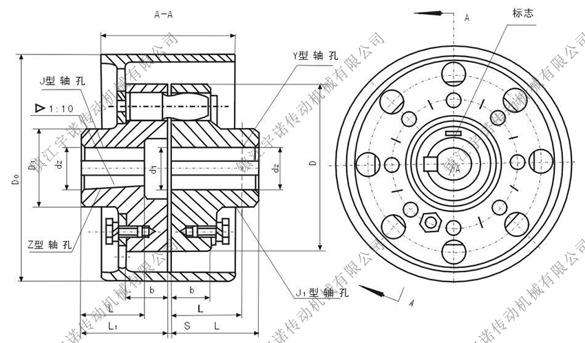 該聯(lián)軸器已列為國家標準GB5014-2003,適用于各種機械聯(lián)接兩同軸線的傳動軸,通常用于動頻繁的高低速運動。工作溫度為-20~+80℃;傳遞公稱轉(zhuǎn)矩為560~35500N.m,許用轉(zhuǎn)速為5600~950r/min。軸孔型式有圓柱形(Y)、圓錐形(Z)和短圓柱形(J)。 軸孔和鍵槽按國家標準GB3852-83《聯(lián)軸器軸柱和鍵槽形式及尺寸》的規(guī)定加工。
