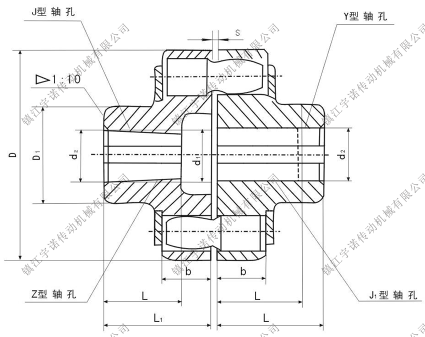 該聯(lián)軸器已列為國(guó)家標(biāo)準(zhǔn)GB5014-2003,適用于各種機(jī)械聯(lián)接兩同軸線的傳動(dòng)軸,通常用于動(dòng)頻繁的高低速運(yùn)動(dòng)。工作溫度為-20 ~+80℃;傳遞公稱轉(zhuǎn)矩為250~180000N.m,許用轉(zhuǎn)速為8500~950r/min。軸孔型式有圓柱形(Y)、圓錐形(Z)和短圓柱形(J)。軸孔和鍵槽按國(guó)家標(biāo)準(zhǔn)GB3852-83《聯(lián)軸器軸柱和鍵槽形式及尺寸》的規(guī)定加工。